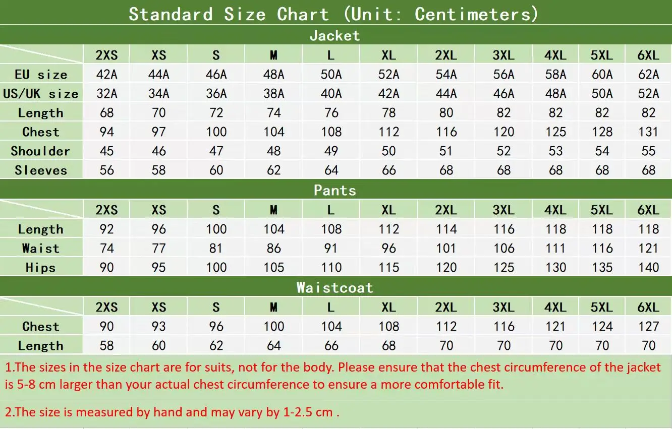 2. Choosing the Size: Please select the closest size based on your chest and waist measurements, referring to the size chart. Please ensure the jacket's chest circumference is 2-3 cm larger than your actual chest circumference for a more comfortable fit. If you are unsure, please provide your height, weight, chest, and waist measurements, and we will recommend the appropriate size for you.