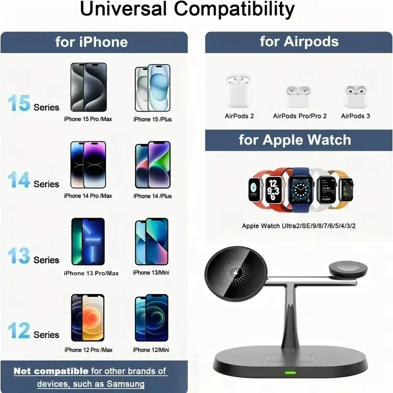 【شواحن لاسلكية 3 في 1】توفر التقنية الجديدة محاذاة مغناطيسية سلسة وشحنًا لاسلكيًا سريعًا بأبسط طريقة لأجهزة iPhone 16 و15 و14 و13 و12، وiPhone 12 Pro Max، وiPhone 12 Mini، وAirPods، وAirPods Pro، وApple Watch 8 و7 و6 وSE و5 و4 و3 و2.(ليس لساعة سامسونج)